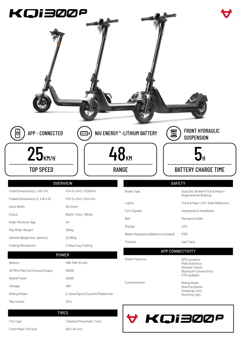 km-t is képesek megtenni egyetlen töltéssel. A NIU KQi 300P és KQi 300X kétcsöves hidraulikus felfüggesztéssel, regeneratív fékkel és alkalmazásalapú vezérléssel van ellátva.